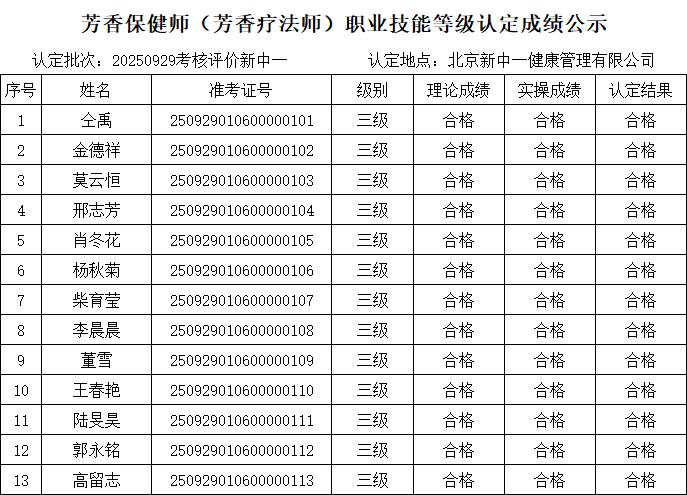 依据人社部《职业技能等级认定工作规程(试行)》(人社职司便函﹝2020﹞17号)及北京新中一健康管理有限公司职业技能等级认定管理制度有关规定,现对2025年9月29日芳香保健师(芳香疗法师)职业技能等级认定成绩予以公示。